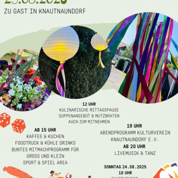 Wie jedes Jahr, seit 1997, feiert Knautnaundorf Ende August gemeinsam mit Freunden und Gästen auf dem Vereinsgelände im Ort. Dazu gibt es am Nachmittag ein umfangreiches Angebot für Kinder. Von der Hü... Weiterlesen